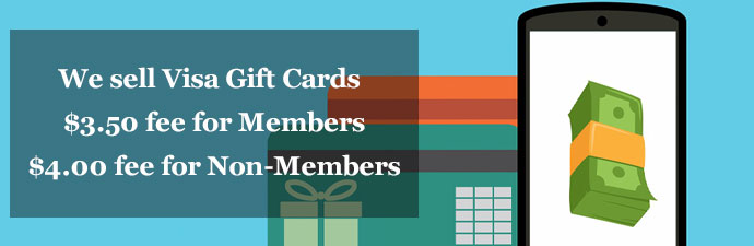 Visa Gift Cards are now available. The fees are $3.50 for members and $4.00 for non-members.